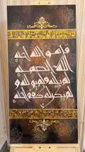 This large-scale calligraphy panel is a magnificent statement piece combining intricate Arabic script with ornamental detailing. The composition is enriched with gold accents and decorative borders, creating a luxurious and regal presentation. The contrast between dark background tones and luminous script enhances clarity and visual impact.