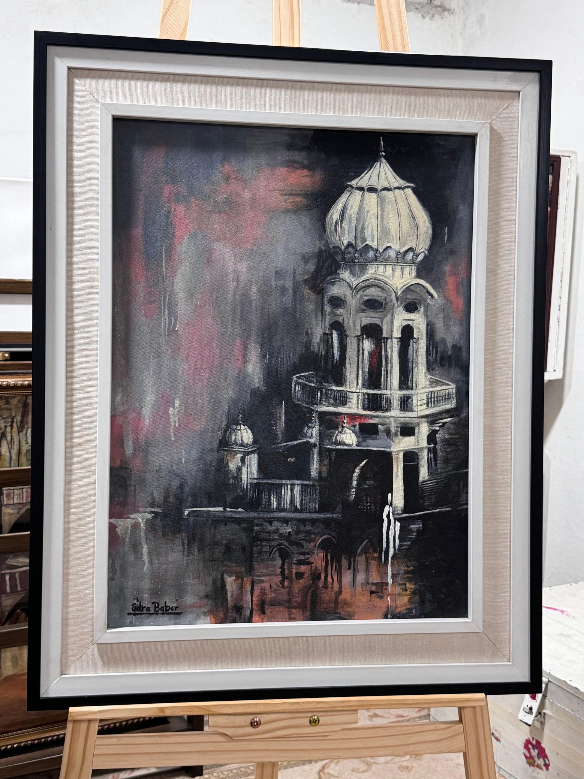 “Minnar” is a striking architectural painting that captures the grandeur and spiritual symbolism of a historic minaret. Rendered in a moody palette of deep greys, charcoal tones, and subtle crimson accents, the artwork conveys both strength and serenity. The dramatic background enhances the monument’s vertical presence, giving it a timeless and almost cinematic quality.