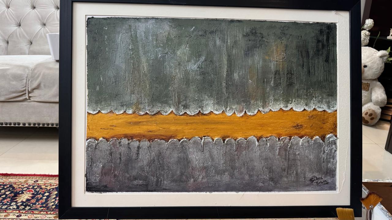 “Waves” is a minimalist seascape inspired composition that captures the rhythmic movement of the ocean. The horizontal contrast between deep tones and sandy textures reflects calm strength and natural balance. The subtle detailing enhances its modern aesthetic.